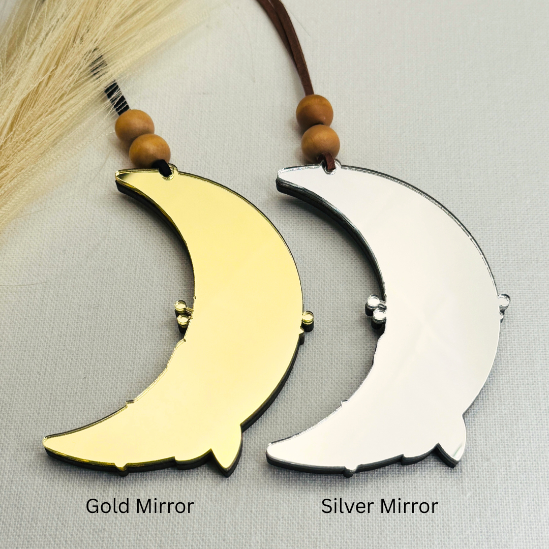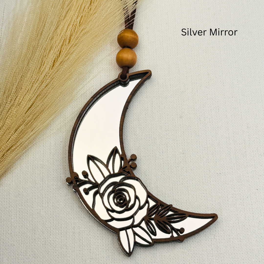 This rose and moon car charm is handmade with two laser-cut layers for a dimensional look. The top layer is cut from walnut wood, sanded smooth, and finished with natural wood oil to highlight the grain. The backing is double-sided mirrored acrylic in your choice of gold or silver (solid mirror on the back).