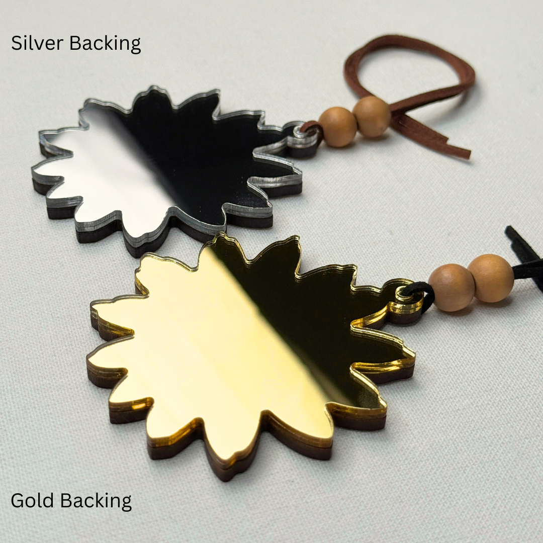 This sunflower car charm is handmade with two laser-cut layers for a dimensional look. The top layer is crafted from walnut wood, sanded smooth, and finished with natural wood oil to highlight its beautiful grain. The backing is made from double-sided mirrored acrylic in your choice of gold or silver, adding a reflective sparkle to your car.